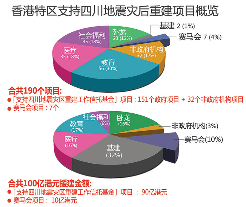 此外,援建金额合共100亿港元,其中拨款 90亿港元于「支援四川地震灾区重建工作信托基金」项目,以及10亿港元于「赛马会项目」。