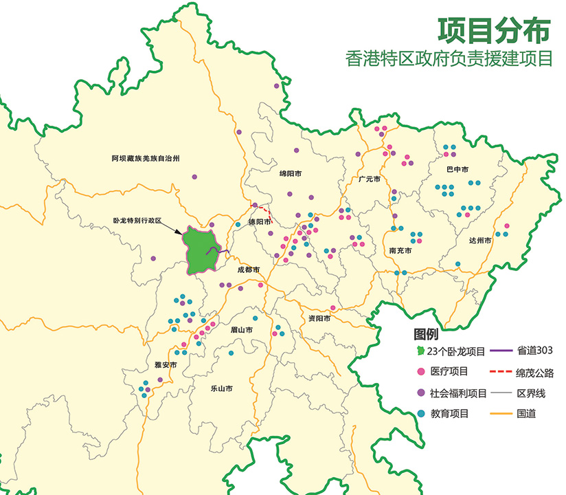 这是香港特区政府负责援建项目的分布图:图中显示151个项目分布于四川省多个县市,包括省道303、绵茂公路、23个卧龙项目、35个医疗项目、35个社会褔利项目、56个教育项目等。